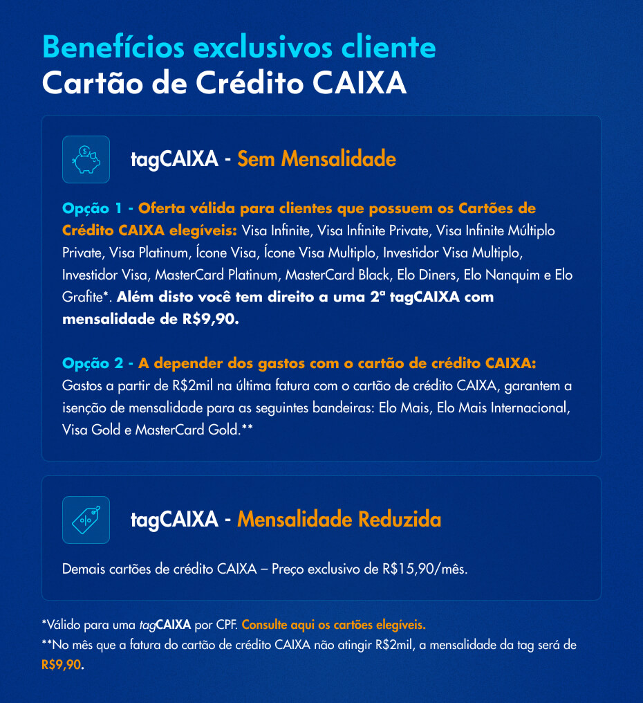 Os cartões de crédito CAIXA descritos abaixo também oferecem condições especiais. TagCAIXA sem mensalidade para gastos acima de 2 mil reais na fatura do seu cartão de crédito CAIXA e tagCAIXA com mensalidade de R$ 9,90 para gastos abaixo de 2 mil reais na fatura do seu cartão de crédito CAIXA, considerando a última fatura fechada.